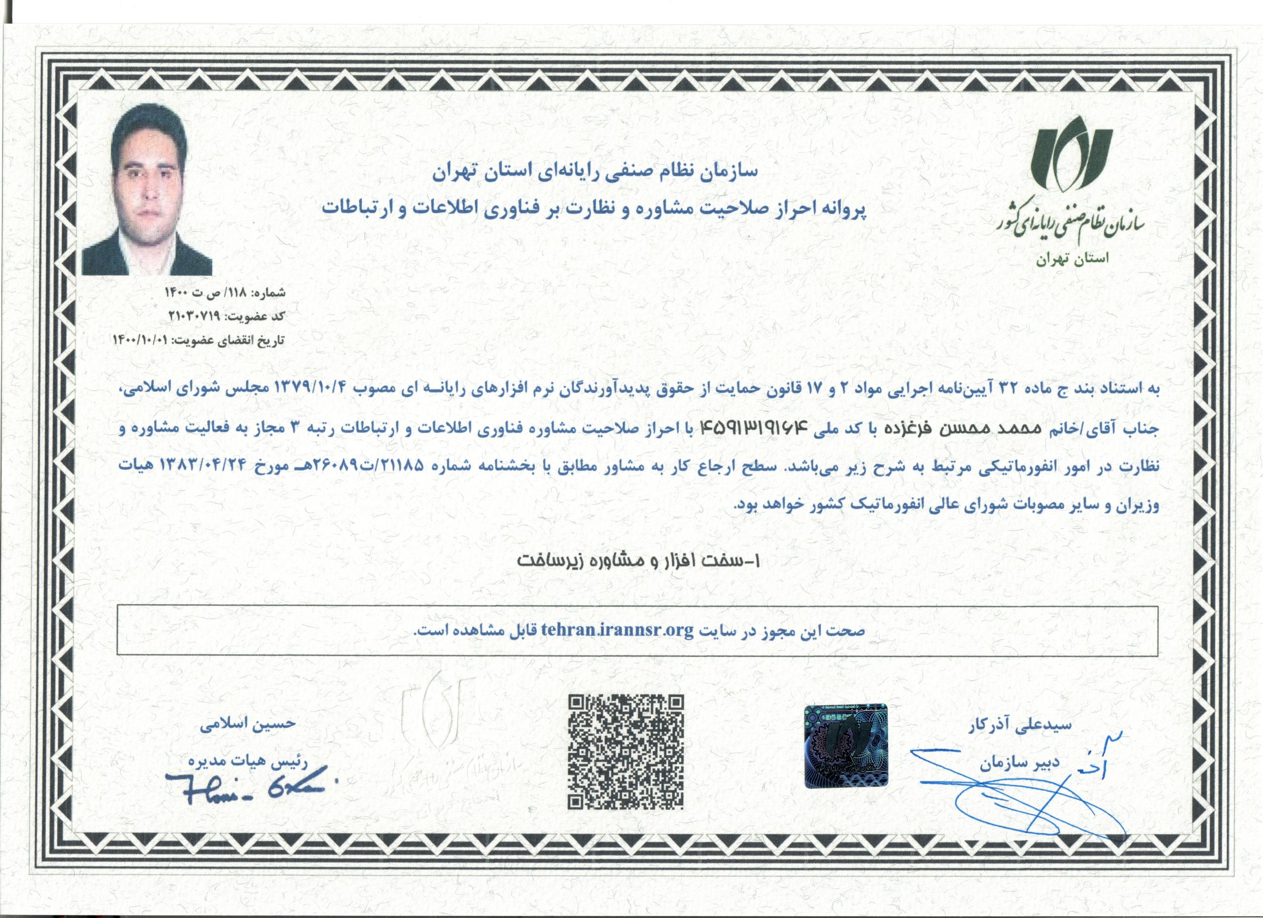 اطلاعات تماس: لینکدین تلفن: 09121482433تلفن همراه: 09121482433نشانی: تهران - خیابان انقلاب - بن بست سروش - پلاک 1126تاریخ تولد: 1982-09-21 12:00:00تحصیلات: 3محمد محسن فرغزدهمحمد محسن فرغزده place qr_code_2 update آخرین بروزرسانی:1 ماه قبلفایلهای پیوست:insert_drive_fileگواهینامه نظامصنفیinsert_drive_fileگواهینامههای تخصصیاطلاعات فعالیت:شاخه فعالیت: DCASTIA-942TIA-942BICSI002BICSI002نوع فعالیت: حقیقی